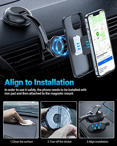 ★ INSTALLATION ET UTILISATION FACILES D’UNE SEULE MAIN – 3 étapes simples. Nettoyez d’abord la surface, puis appuyez sur le support telephone voiture ventouse pendant au moins 5 secondes et, à la fin, fermez-le. Il vous permet de mettre facilement le téléphone portable sur le aimant telephone voiture et de le retirer d’une seule main.