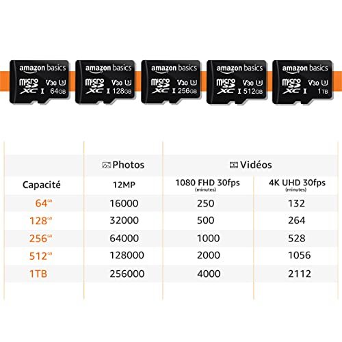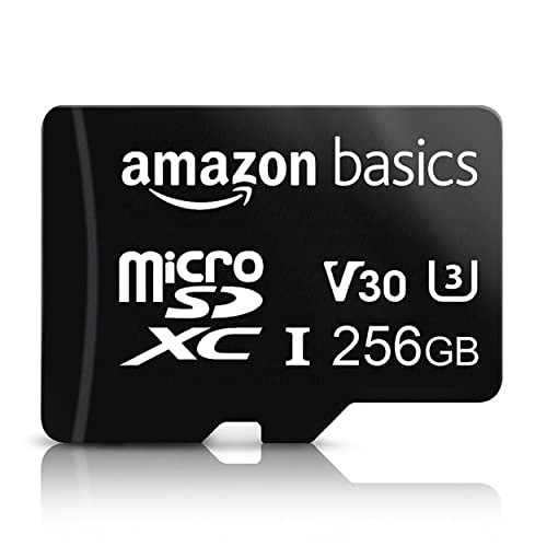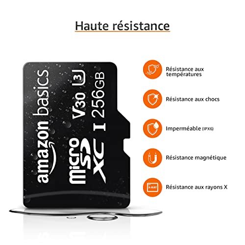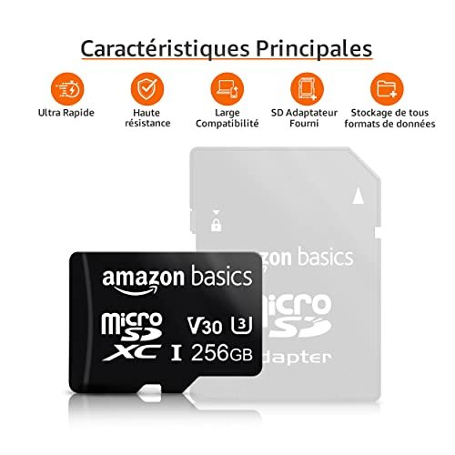 Amazon Basics – Carte Mémoire MicroSDXC, 256 Go, avec Adaptateur SD, A2, U3, vitesse de lecture maximale de 100 Mo/s