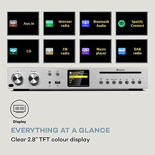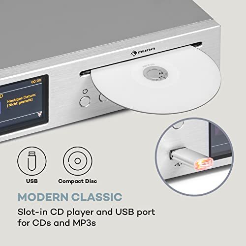 auna Star – Récepteur CD Hi-FI Amplificateur, Internet/Dab+/FM-Radio, Amplificateur Hi-FI, Récepteur Hi-FI, Lecteur CD – Argent