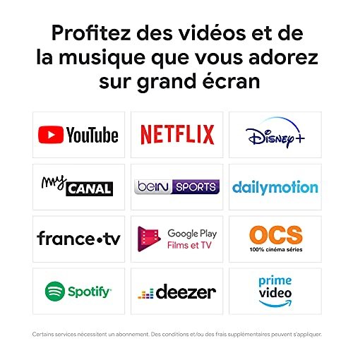 Profitez des vidéos et de la musique que vous adorez sur grand écran. Accédez à des séries TV, des films, des vidéos, des chansons, des jeux, des contenus sportifs et plus, grâce à des centaines d’applications compatibles telles que Netflix, YouTube, mycanal, OCS, Spotify et bien d’autres encore, à découvrir