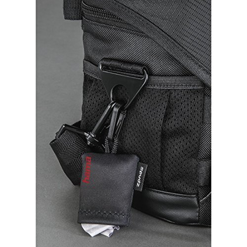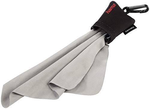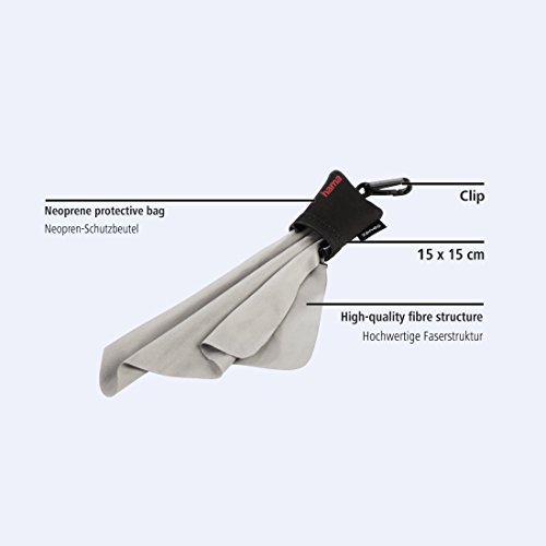 Hama Chiffon de nettoyage « Pocket » (pour le nettoyage, en microfibre, pour appareil photo/objectif/filtre/lunettes, 15 x 15 cm, dans une pochette pratique en néoprène avec mousqueton) Noir/Gris