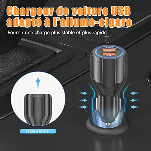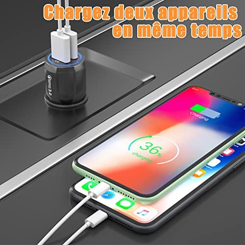Chargeur de voiture à double port : lorsque 2 appareils sont connectés, le chargeur de voiture à double USB de Hoppac les charge simultan ment, et le port QC3.0 charge les t l phones qui supportent la charge rapide.