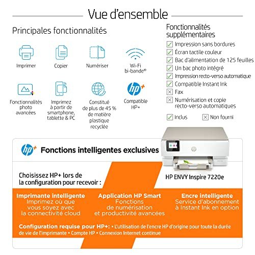 HP Envy Inspire 7220e Imprimante tout en un – Jet d’encre couleur – 6 mois d’Instant Ink inclus avec HP+ (Photocopie, Scan, Impression, Photo, A4, Recto/Verso, Wifi), Blanc