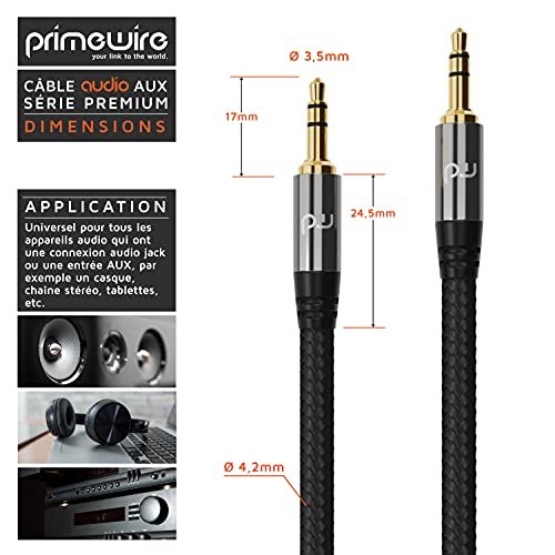 Primewire – 3m Câble Jack mâle à mâle, câble auxiliaire Jack Audio stéréo 3.5mm, rallonge Jack à Jack 3 pôles, connecteurs plaqués Or, Compatible avec iPads, Smartphones, Casques, Enceintes PC, TV