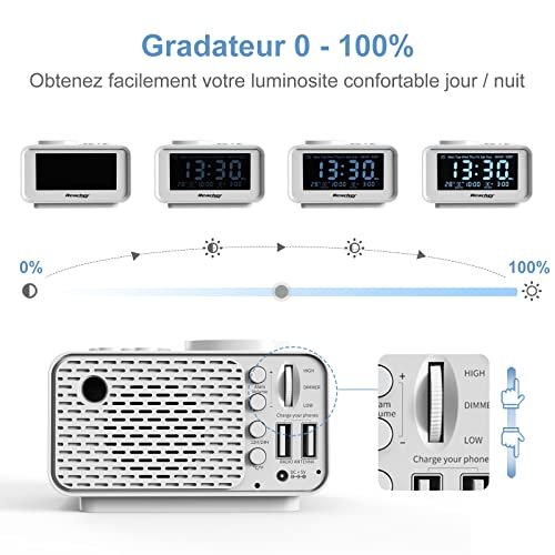 【0-100% Gradateur】Grâce aux écrans grands de 3,2 pouce avec la luminosité réglable(12/24 heures Format), c’est facile à lire les chiffres sur l’écran au loin.Le radio-réveil possède 0-100% niveaux d’éclairages différents réglables jusqu’au niveau éteint pour ne pas déranger ceux qui souhaitent dormir sans lumière.