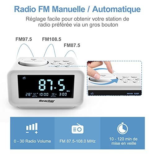 REACHER Radio Réveil avec Ports USB de Chargement,0-100% Gradateur, Volume d’alarme réglable, Affichage du thermomètre, Radio FM avec minuterie de Sommeil,Petite Taille pour Chambres à Coucher (Blanc)