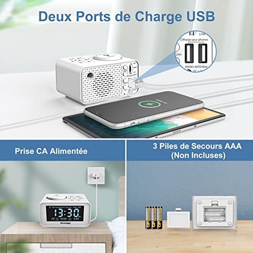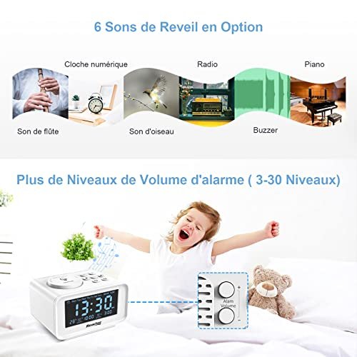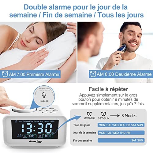 【Double alarme & 6 sons d’alarme】Deux alarmes séparées pour la semaine et le week-end, réveil par radio ou par 5 sons naturels en option (flûte,oiseau,piano,buzzer et clochette numérique),Réglez votre volume d’alarme confortable à tout moment via des boutons séparés à grande portée. L’alarme de démarrage progressif devient plus silencieuse et s’amplifie progressivement.