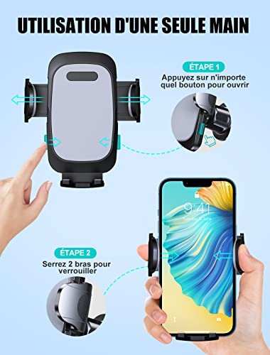 Utilisation à une main – Équipé du bouton de fermeture rapide et des bras de serrage réglables, le support de téléphone de voiture beaucoup plus facile à insérer et à retirer votre téléphone d’une seule main. Vous offre une conduite en toute sécurité, que vous parliez ou naviguez, écoutez de la musique ou chargez.