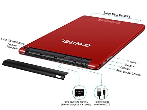 Tablette Tactile 10 Pouces Android 11 GOODTEL 4Go RAM + 64Go ROM avec 8 Cœurs | Double Caméra 5+8MP | Batterie 8000mAh | WiFi | Bluetooth | MicroSD/TF 4-256 Go, avec Cas, Clavier et Souris – Rouge